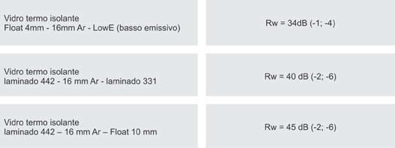 Na tabela abaixo está apresentado um coeficiente de isolamento acústico (Rw) para os mais utilizados tipos de vidro termo isolante: