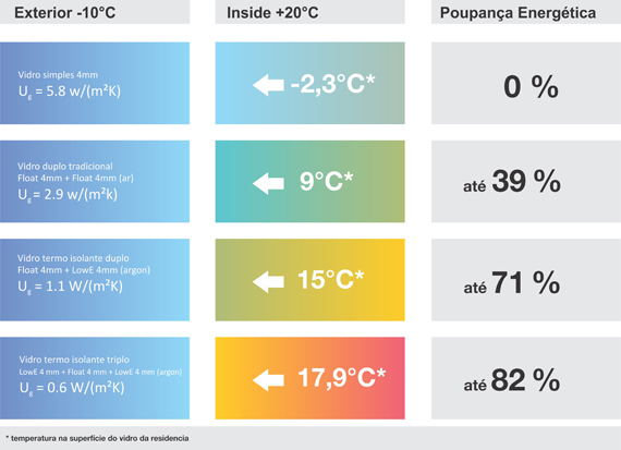 Do gráfico abaixo se podem deduzir facilmente o excedente de conforto e as poupanças energéticas obtidas através da escolha dumas janelas com um coeficiente de isolamento mais reduzido possível.